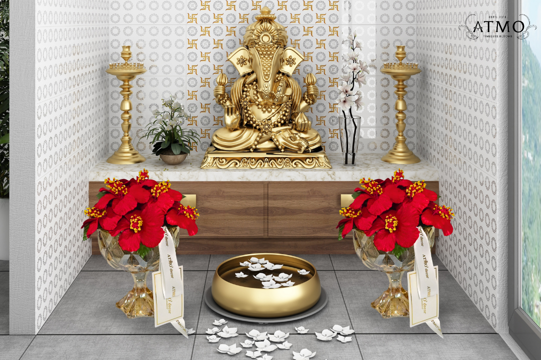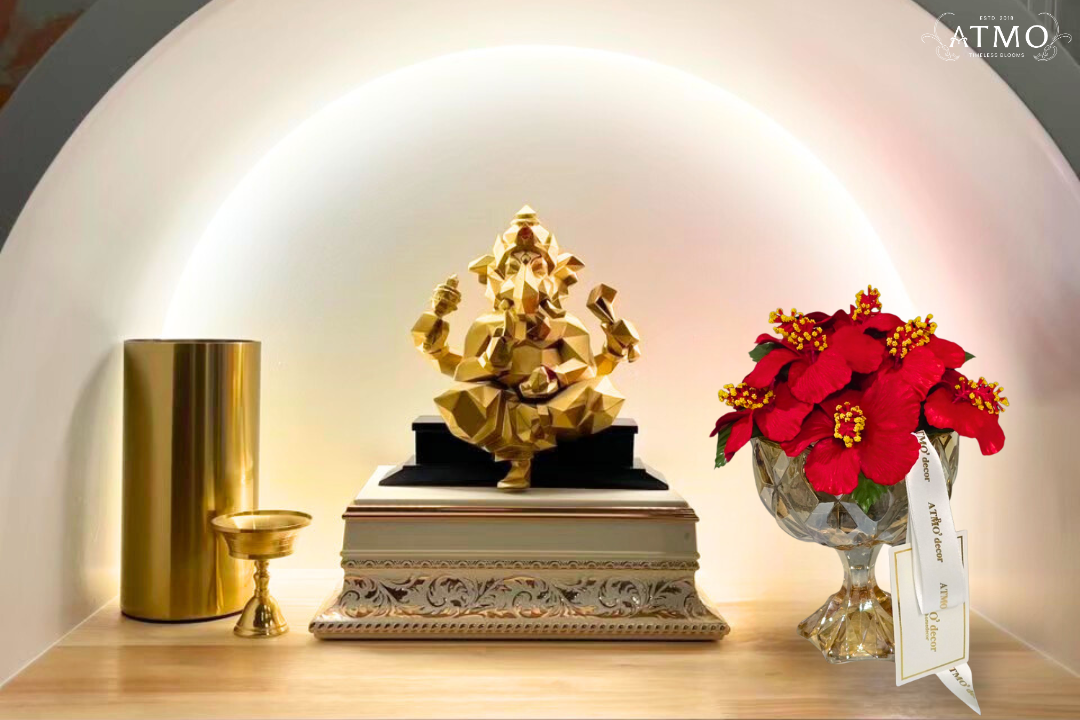หมายเหตุ: การจัดดอกไม้สำหรับการบูชาองค์พระพิฆเนศควรเน้นความเรียบง่ายแต่สง่างาม เลือกใช้แจกันที่มีคุณภาพสูง เพื่อเสริมบารมีและดึงดูดพลังบวกเข้าสู่บ้าน