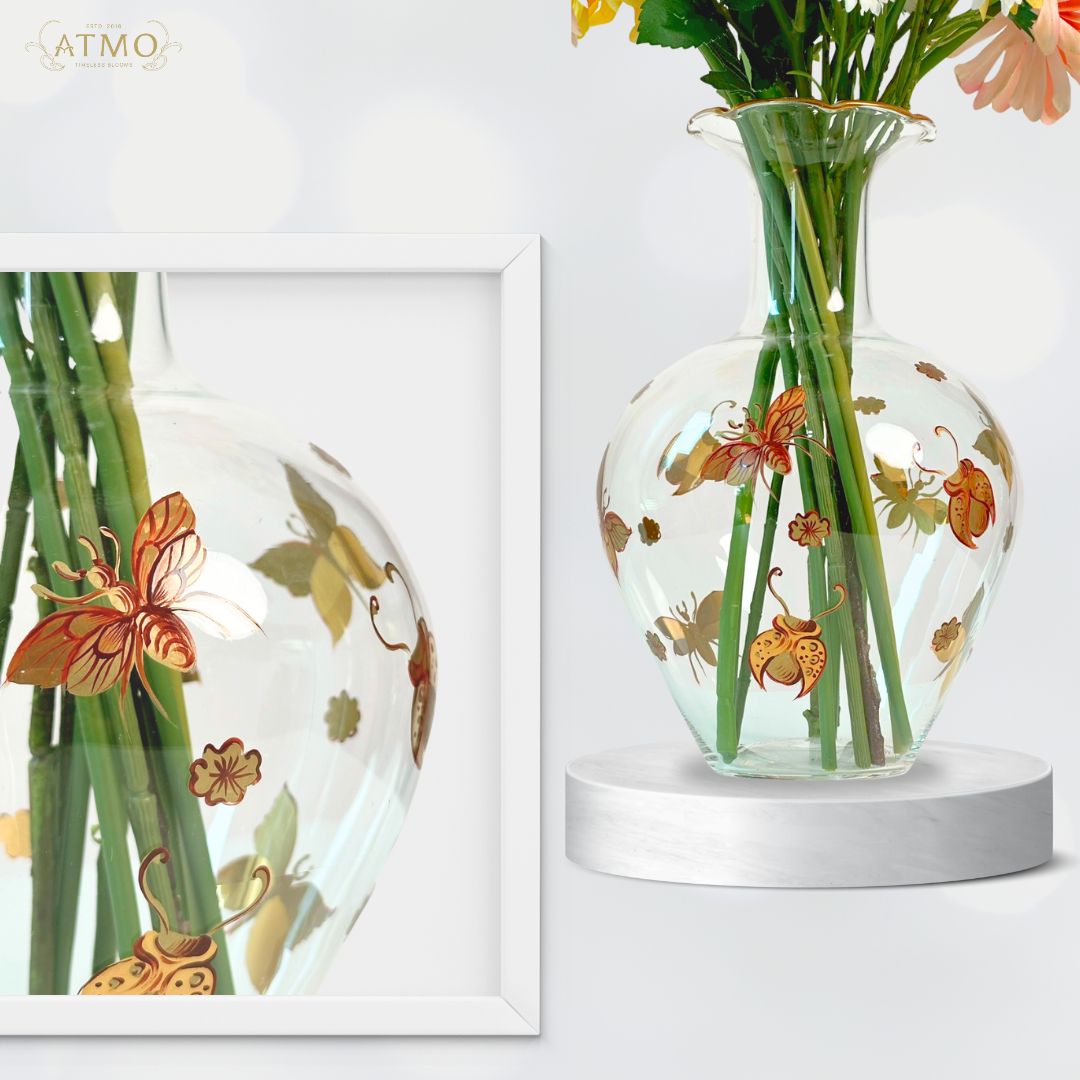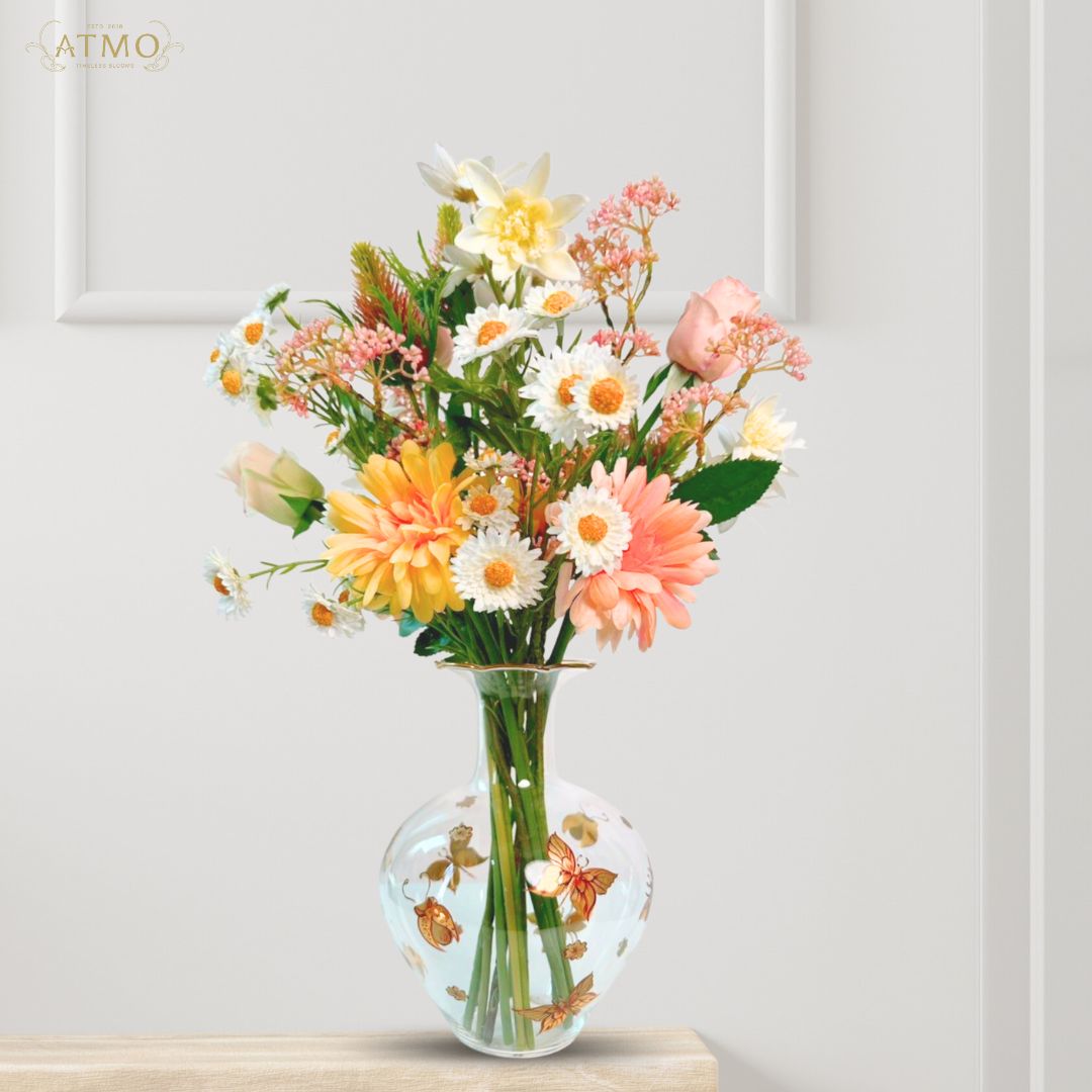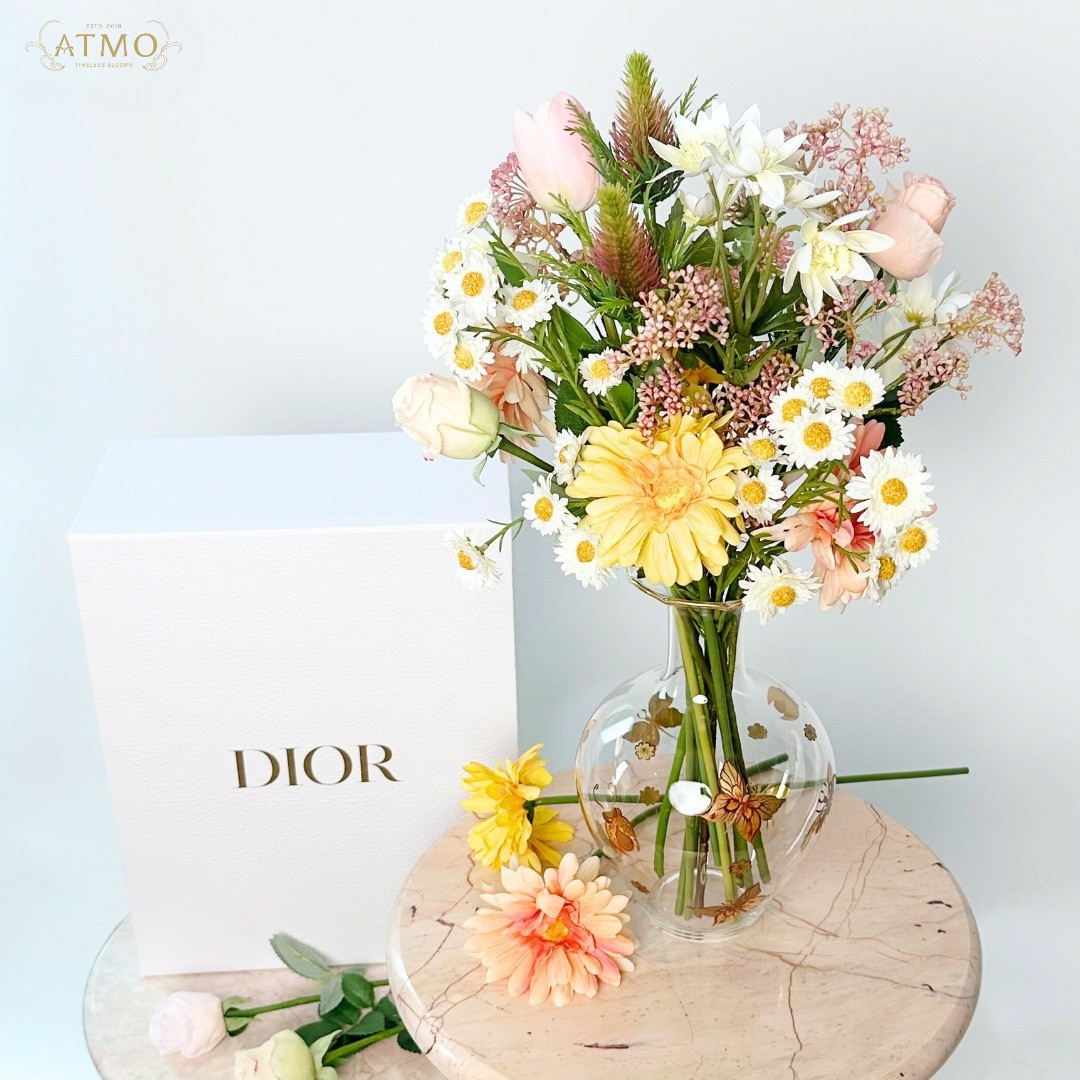 แน่นอนว่าการจัดดอกไม้ให้เข้ากับแจกัน Dior เพื่อเพิ่มความสวยงามและความหรูหรา ควรเลือกดอกไม้ที่มีสีสันนุ่มนวล เพื่อให้เข้ากับลวดลายของแจกัน ดอกไม้ประดิษฐ์จากแบรนด์ Atmo Decor ที่มีโทนสีอ่อนจะเข้ากันได้ดีกับแจกันใบนี้ จะช่วยเสริมความหรูหราและความสง่างามให้กับมุมต่างๆ ของบ้านได้อย่างลงตัว