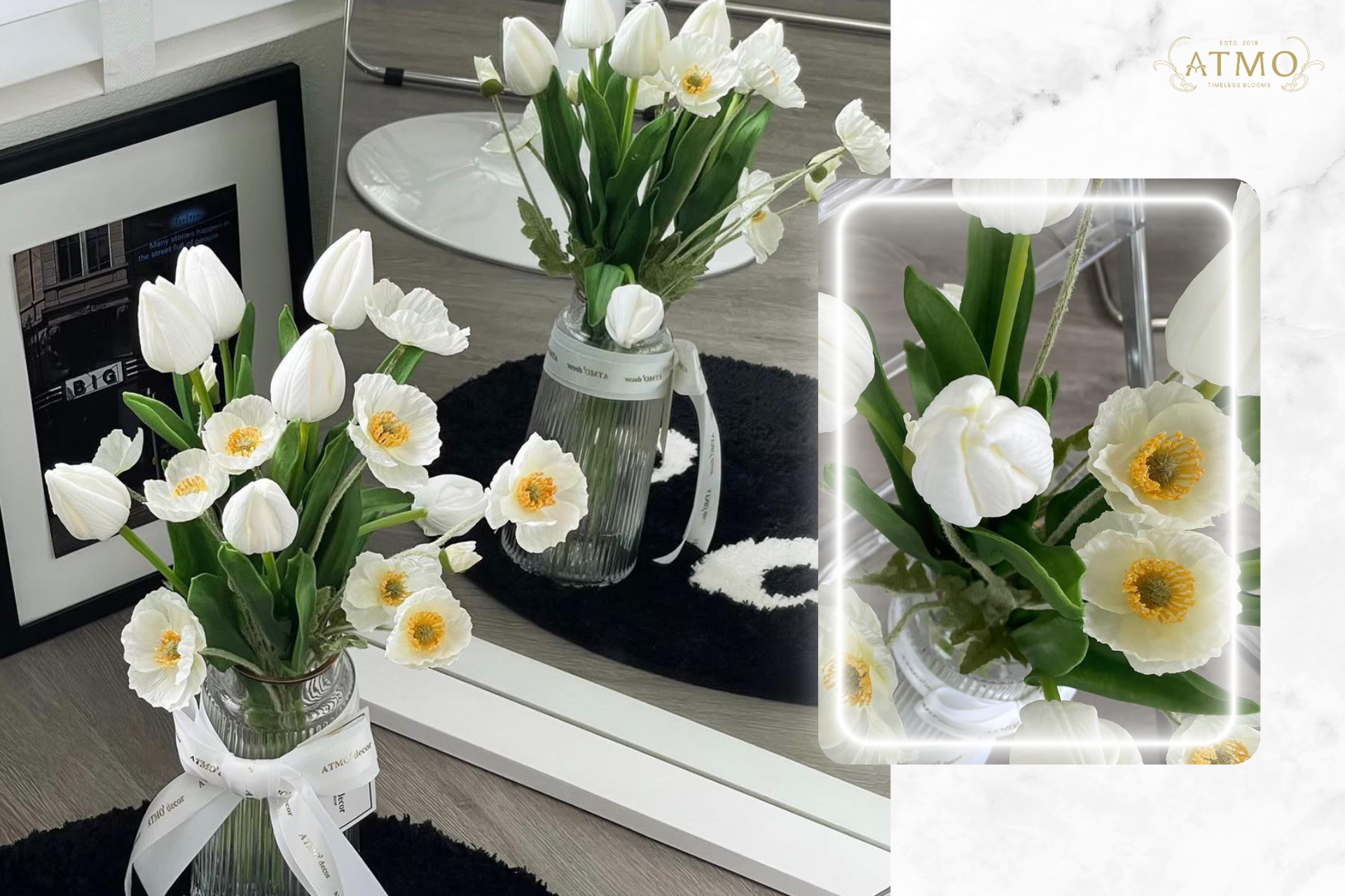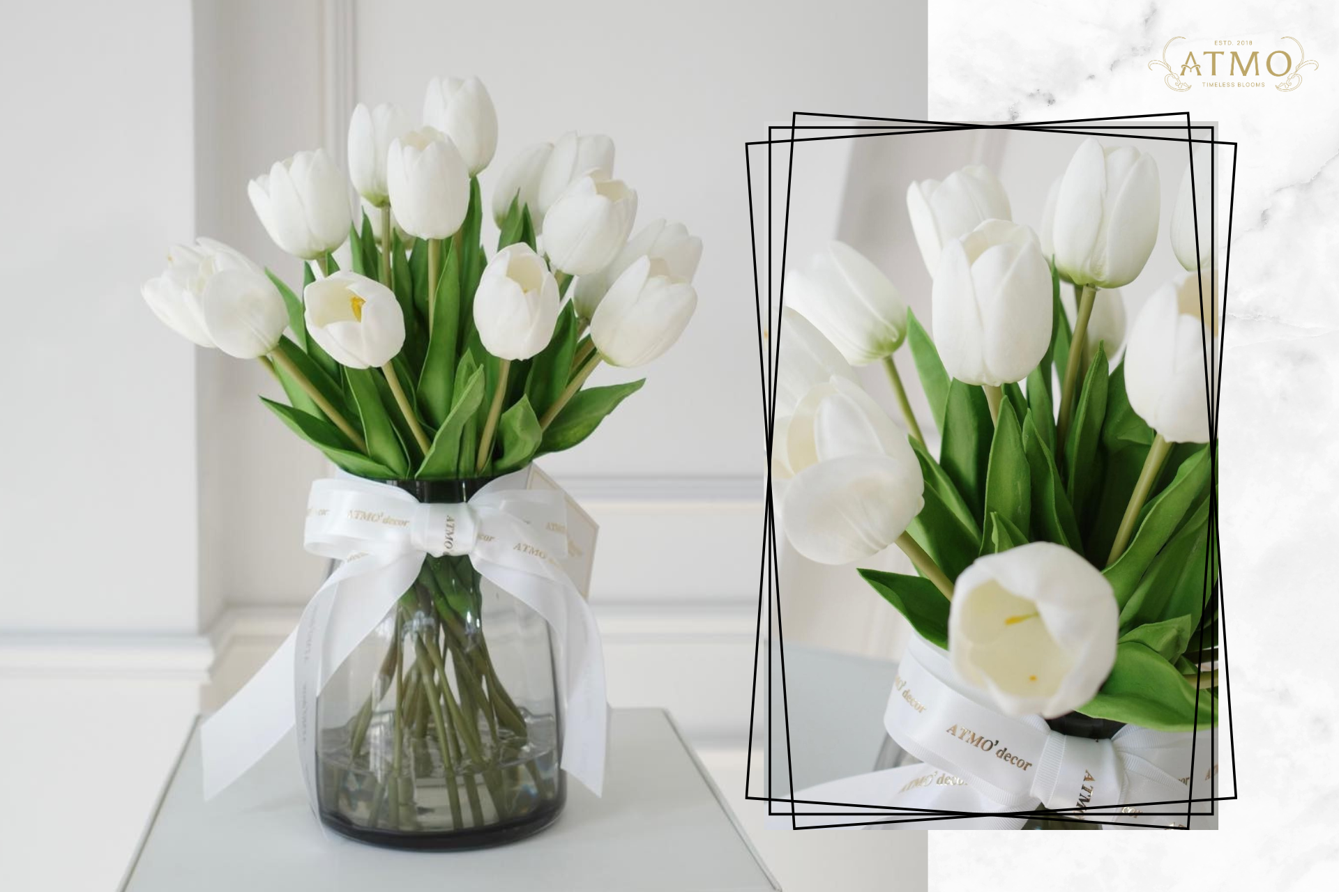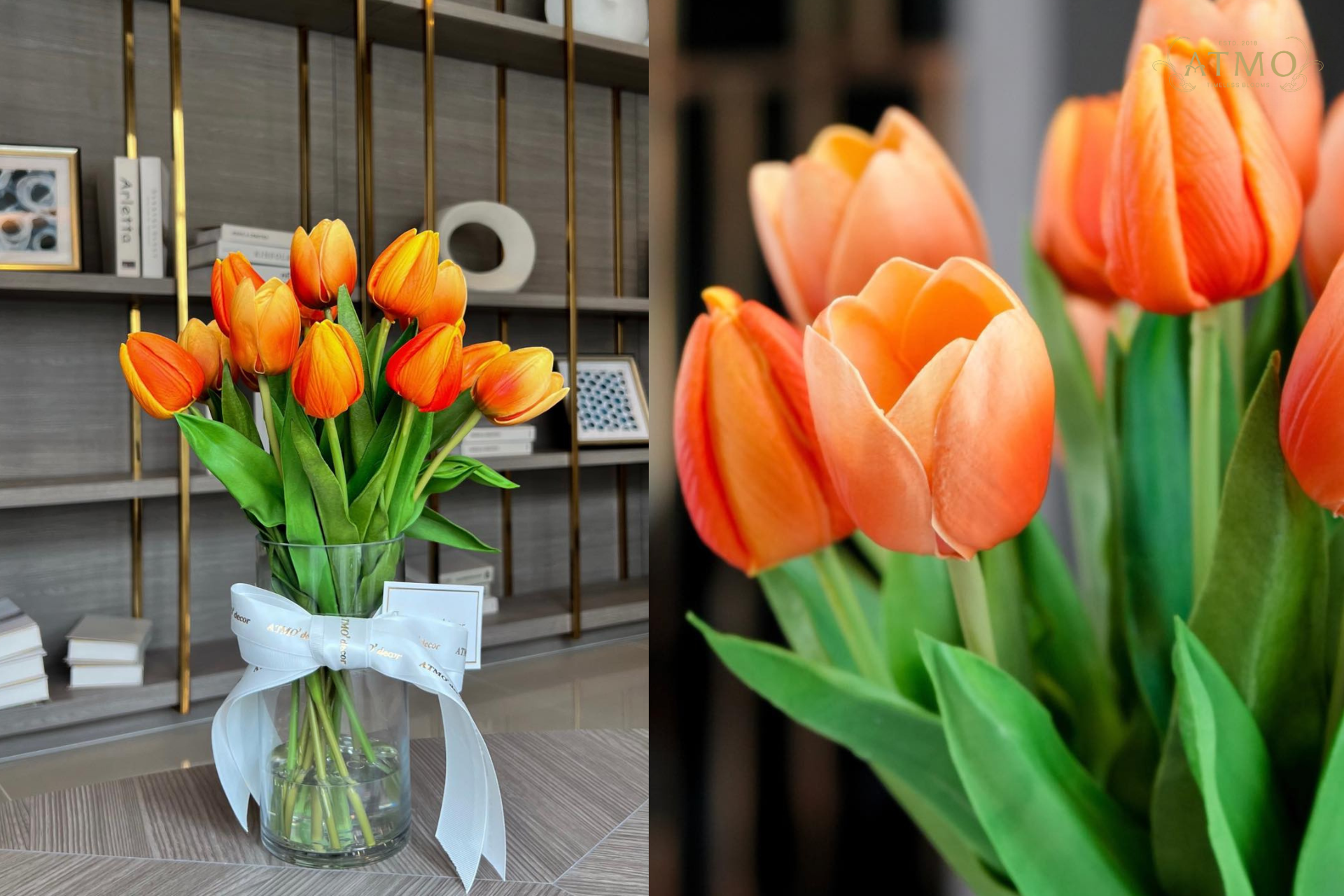 น้ำเองอยากบอกว่าน้ำก็ชอบให้บ้านดูมีชีวิตชีวา การมีแจกกันดอกทิวลิปไว้แต่งบ้านไม่ว่ามุมไหนก็เข้ากัน Atmo Decor ก็มีดอกทิวลิปให้เลือกหลายเฉดสี ที่สำคัญดอกไม้ที่ใช้เป็นดอกไม้ประดิษฐ์เกรดพรีเมียม งานละเอียดระดับเสมือนจริง แทบแยกไม่ออกเลยว่านี้คือดอกไม้ประดิษฐ์ไม่ใช่ดอกไม้สด