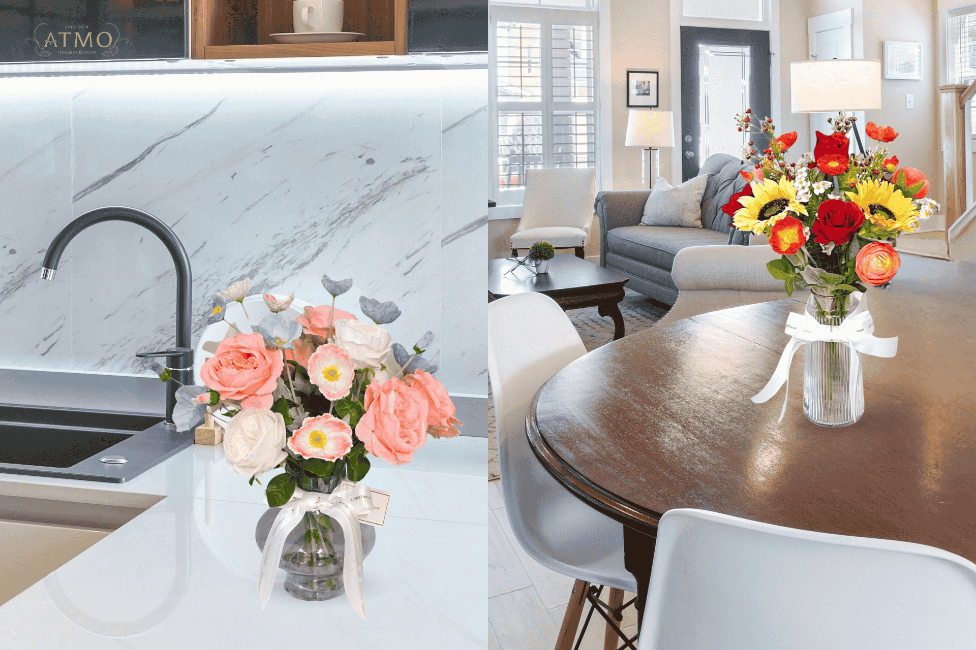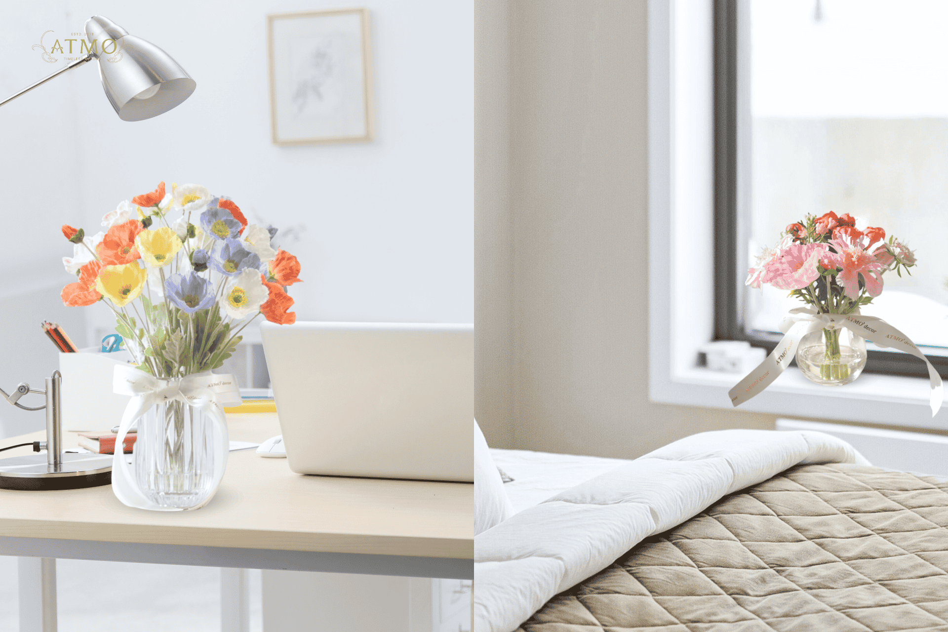 การคุมโทนสีช่วยให้พื้นที่เล็กดูเป็นระเบียบและสวยลงตัวมากขึ้น เช่น แจกันแก้วใสคู่กับดอกไม้โทนขาว–เขียว หรือแจกันสีดำคู่กับดอกไม้โทนพาสเทล จะช่วยให้ภาพรวมของมุมเล็กๆ ดูแพงขึ้น