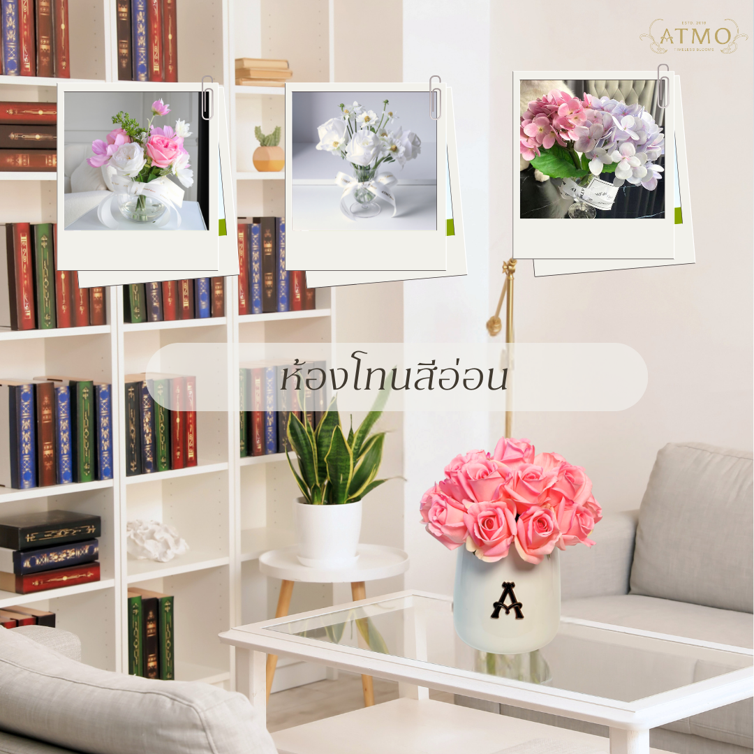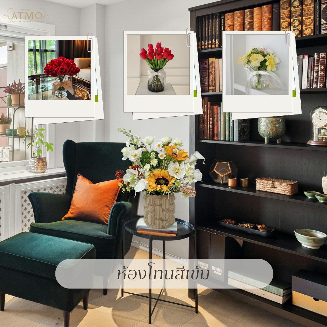 ถ้ามุมอ่านหนังสือมีโทนอบอุ่น เช่น น้ำตาล ครีม หรือไม้สีธรรมชาติ ดอกไม้สีพาสเทล ชมพู ฟ้าอ่อน หรือสีขาว ก็ช่วยเสริมความละมุนให้พื้นที่ดูอบอุ่นมากขึ้น แต่ถ้าเป็นชั้นหนังสือโทนเข้มอย่างไม้สีดำ หรือห้องที่มีเฟอร์นิเจอร์โมเดิร์น ลองใช้ดอกไม้สีสด เช่น ทานตะวัน หรือกุหลาบสีแดง จะช่วยให้มุมดูมีพลังขึ้นค่ะ