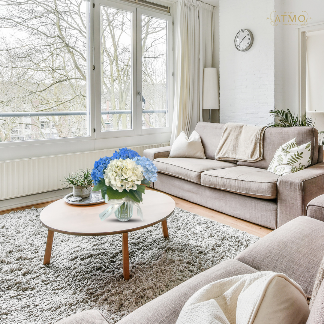 แจกันในห้องรับแขกควรวางในตำแหน่งที่มองเห็นชัด เช่น โต๊ะกลาง โซฟามุมหลัก หรือเคาน์เตอร์ใกล้ประตู เพื่อให้ดอกไม้ทำหน้าที่เหมือน “การทักทาย” ที่อบอุ่นตั้งแต่แรกเห็นค่ะ