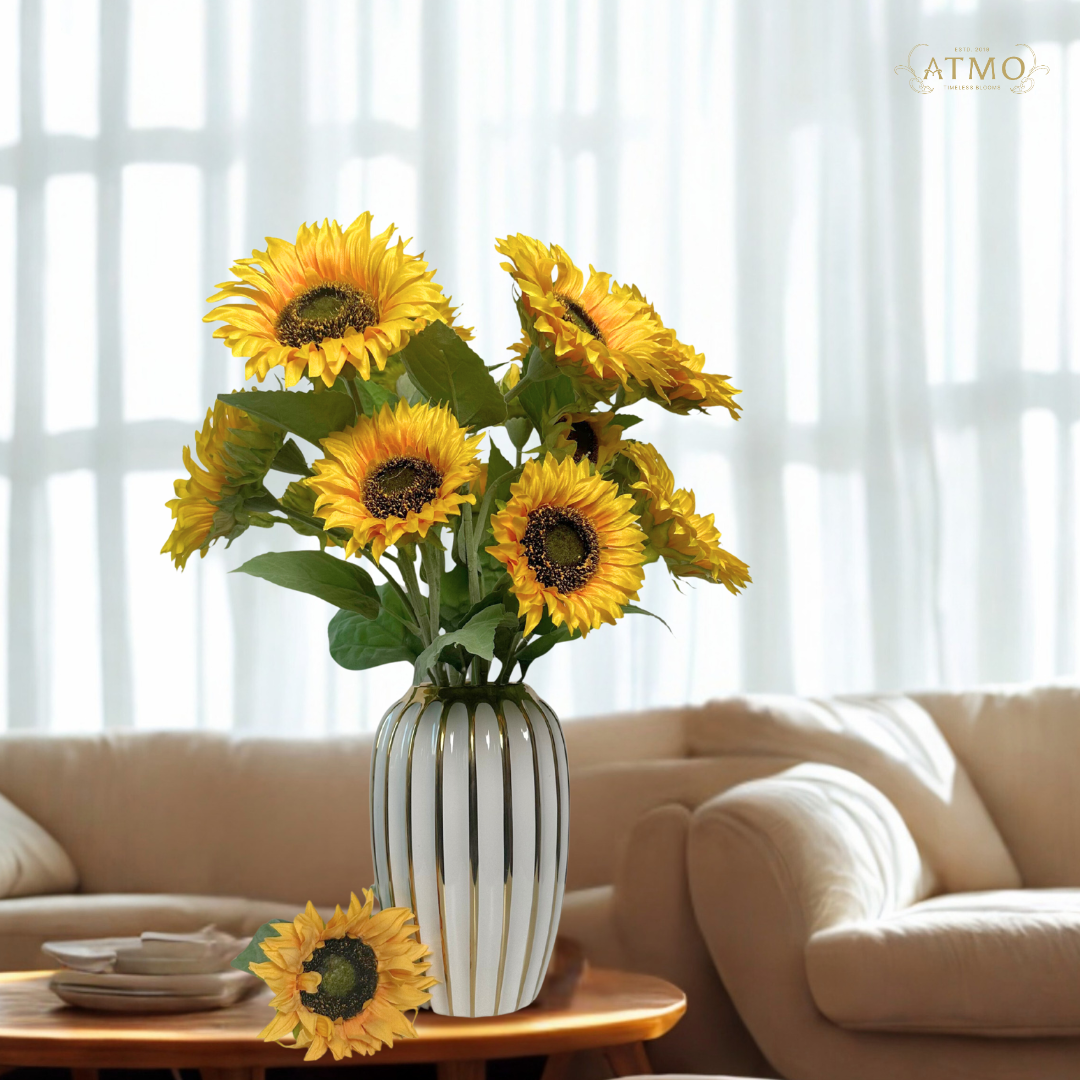 วันไหนที่รู้สึกเหนื่อย ๆ ลองหาดอกไม้สีเหลืองสดใสอย่างทานตะวันมาจัดสิคะ เหมือนเติมวิตามินให้หัวใจเลยทีเดียว วางในแจกันทรงสูงสีขาวหรือแก้วใส ๆ รับรองห้องนั้นจะสดชื่นขึ้นแบบทันตาเห็นเลยค่ะ