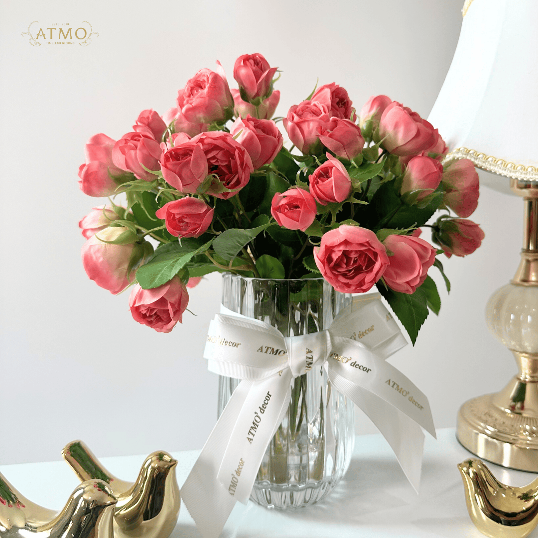 2. ใช้ดอกไม้ประดิษฐ์ที่มีโทนสีสุภาพ เช่น ขาว ครีม หรือโรสโกลด์ เพื่อขับให้ห้องดูหรูหราแต่ไม่อึดอัด หรือแจกันขอบทองเส้นบางๆ แทนการใช้แจกันสีทองเต็มใบ ยังคงทำให้ดูหรูหราและดูไม่หนักสายตาเกินไป