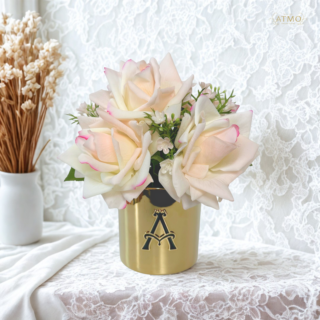 ถ้ากุหลาบสีขาวคือความบริสุทธิ์ กุหลาบสีชมพูอ่อนก็คือความสุขและความอ่อนโยน มันเป็นความรู้สึกดีๆ ที่ค่อยๆ ก่อตัวขึ้นอย่างอบอุ่น ไม่ได้หวือหวาเหมือนความรักแบบหนัง แต่เป็นความรักที่ค่อยๆ เติมเต็มในทุกๆ วัน พอเอามาใส่ในแจกันทองปุ๊บ ความสุขเล็กๆ เหล่านั้นก็ดูมีน้ำหนักมากขึ้นมาทันทีเลยล่ะ เหมือนแจกันทองกำลังบอกเราว่าความสุขที่เรามีในทุกวันนั้นเป็นสิ่งที่ควรค่าแก่การเก็บรักษาเอาไว้ให้ดีที่สุด แจกันทองกับดอกกุหลาบสีชมพูอ่อน จึงเหมาะกับคนที่กำลังมีความรักที่ค่อยเป็นค่อยไป หรือคนที่กำลังมีความสุขกับชีวิตในแบบของตัวเอง เป็นการให้ของขวัญที่สื่อถึงความสุข ความอ่อนโยน และความเข้าใจที่ลึกซึ้ง