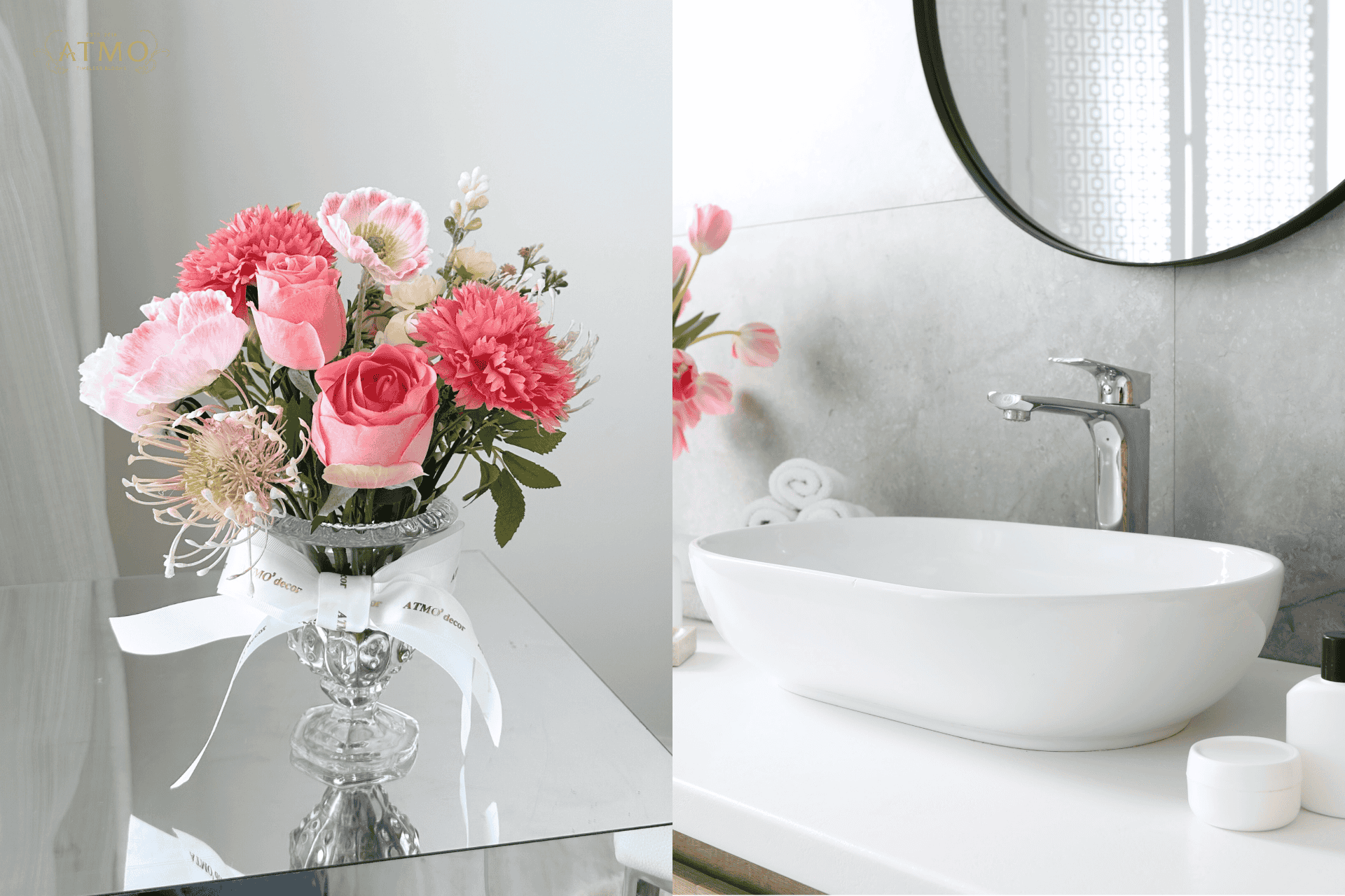 หลักการจัดวาง: พื้นที่มีจำกัดและมักเปียกชื้น ควรใช้แจกันขนาดเล็ก เพื่อไม่ให้เกะกะพื้นที่ใช้งาน แต่ยังคงช่วยเพิ่มความสดชื่นและยกระดับห้องน้ำให้ดูสะอาดหรูหราขึ้น
