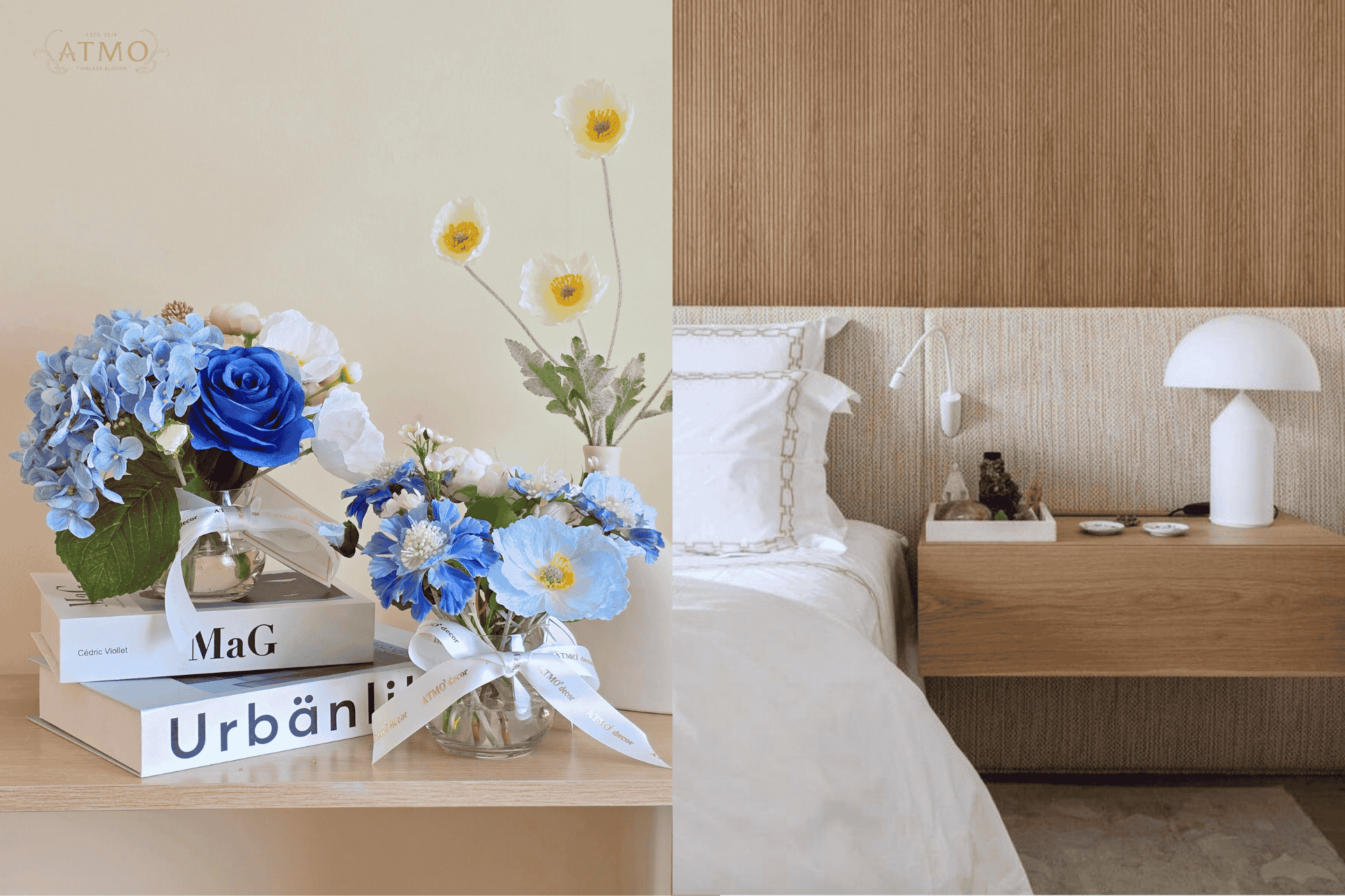 หลักการจัดวาง: พื้นที่ส่วนตัวที่ต้องการความผ่อนคลาย แจกันควรมี ขนาดเล็กถึงกลางและควรเน้นโทนสีที่สงบและสบายตา เพื่อส่งเสริมการพักผ่อน