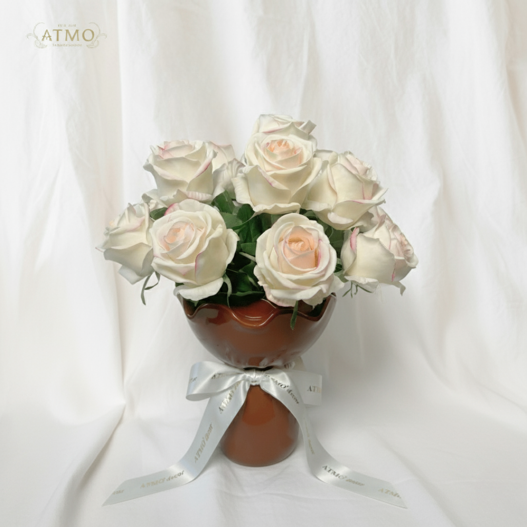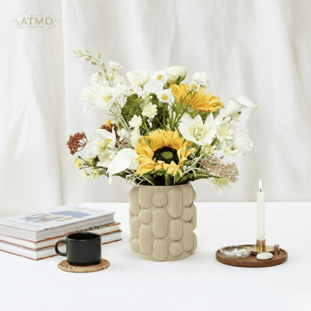 การจัดวางแจกันดอกไม้ประดิษฐ์ในโทนสี เบจ ขาว ทอง และน้ำตาลอ่อนจาก ATMO decor จึงเป็นการมอบ 'ความสงบเงียบและความสบายใจ' ที่ยั่งยืนให้กับตัวเราเองและพื้นที่ที่เราอยู่