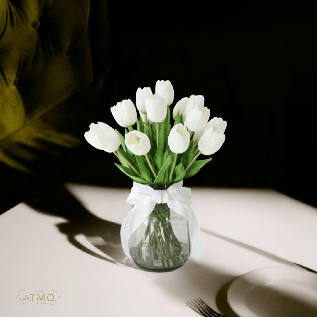 การตกแต่ง: ทิวลิปถูกจัดวางในแจกันแก้วใสเพื่อเน้นความ Minimal Luxury รูปลักษณ์ที่เรียบง่าย แต่ทรงพลังนี้ทำให้ห้องดูโปร่งโล่งและให้ความรู้สึกสงบแต่หรูหราได้อย่างลงตัว