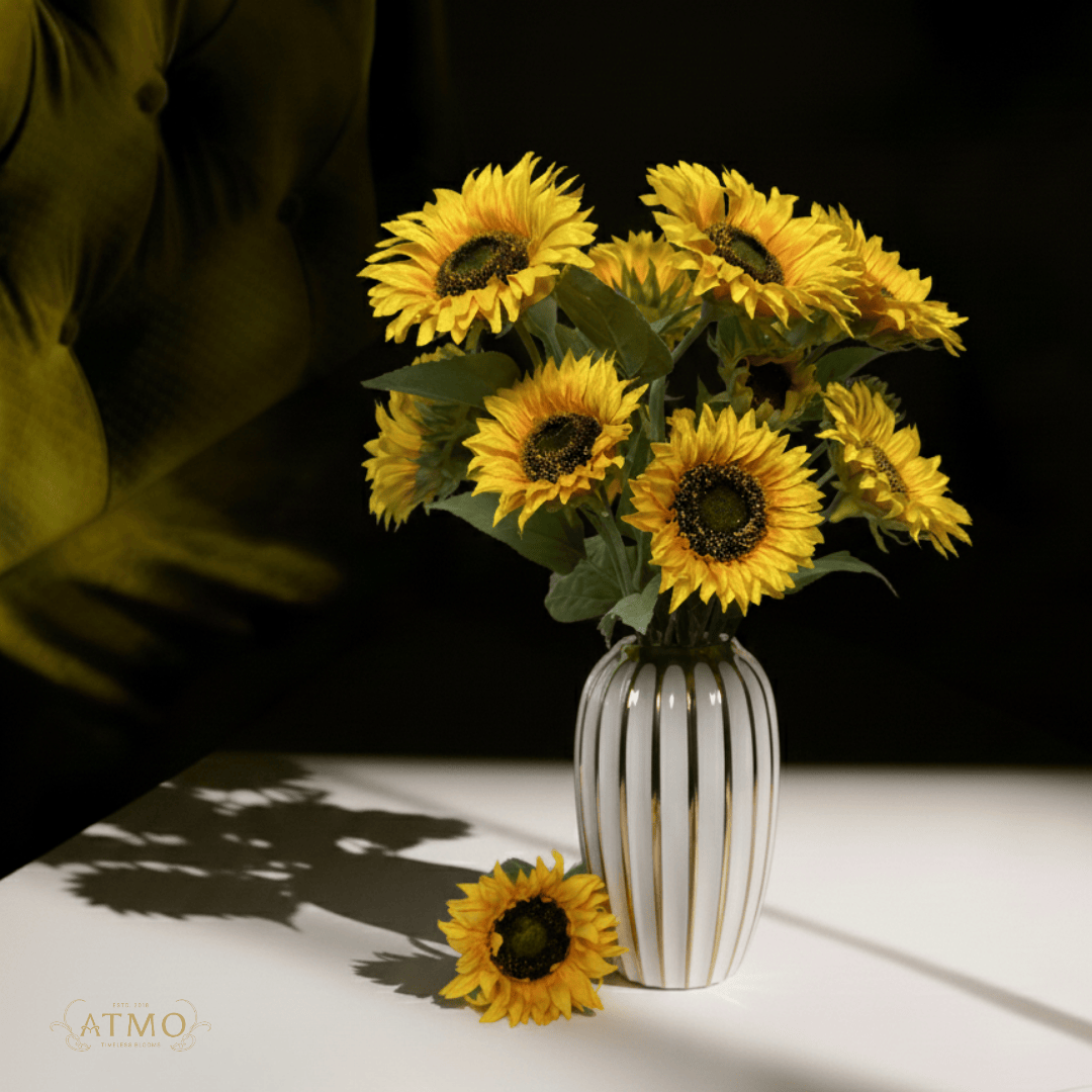 การตกแต่ง: การใช้ทานตะวันในแจกันที่มีทรงสูง เป็นการสร้างจุดโฟกัสที่สดใสบนพื้นผิวสีขาวหรือโทนเข้มได้เป็นอย่างดี เป็นการเติมความอบอุ่นและชีวิตชีวาที่ตัดกับความหนาวเย็นได้อย่างมีสไตล์
