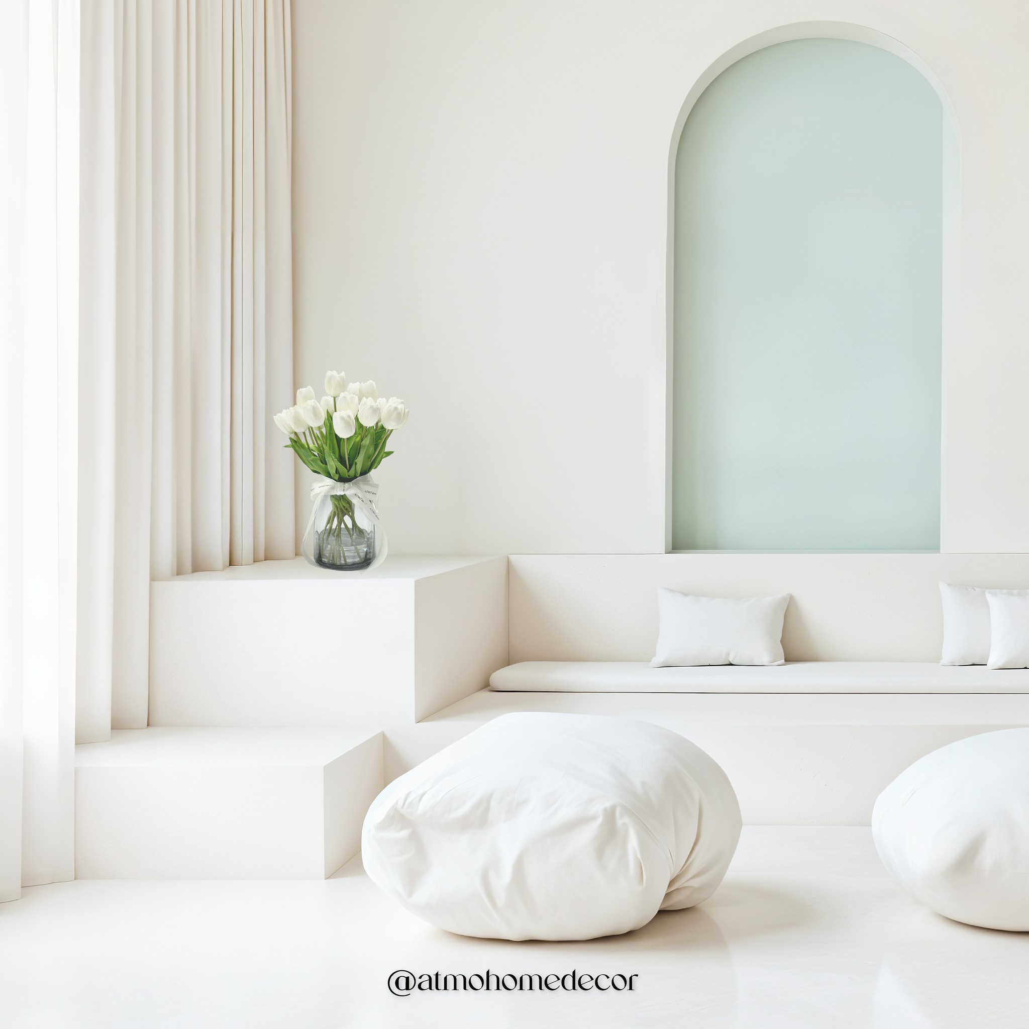 เทคนิคการแต่งบ้านด้วยแจกันดอกไม้โทนนี้ การนำดอกไม้โทนขาวนิวทรัลจาก Atmo Decor มาจัดวางในมุมห้องจะช่วยสร้างจุดนำสายตาที่ดูละมุนตา