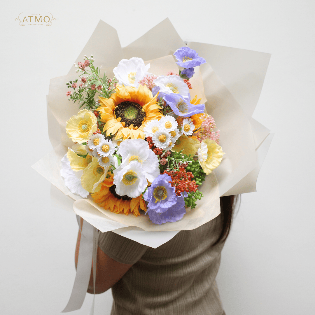ความประณีตที่สัมผัสได้: ช่อดอกไม้ประดิษฐ์จาก Atmo Decor เน้นการจับคู่โทนสีที่ละมุนตา เช่น ชมพูพีชหรือเหลืองสดใส พร้อมโบ Signature สีขาวสกรีนทองบนใยผ้าคุณภาพสูง ทุกรายละเอียดถูกคิดมาเพื่อล็อคความรู้สึกดีๆ ไว้ในภาพจำที่สวยงามที่สุด