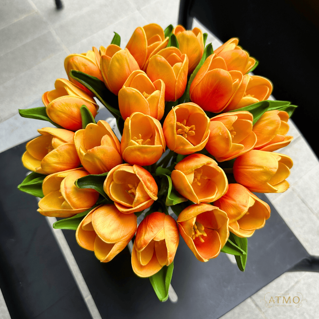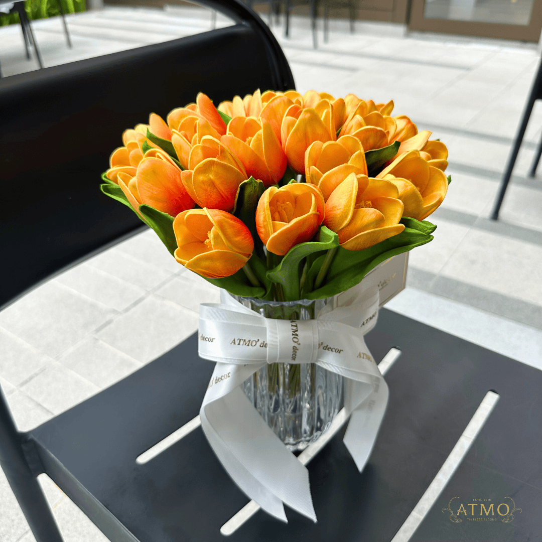 - โต๊ะทำงาน: เปลี่ยนมุมทำงานที่เคร่งเครียดให้ผ่อนคลายขึ้น ทิวลิปสีส้มจะทำหน้าที่เป็น "จุดพักสายตา" ที่ช่วยรีเฟรชสมองและกระตุ้นไอเดียใหม่ๆ ในวันที่เหนื่อยล้า